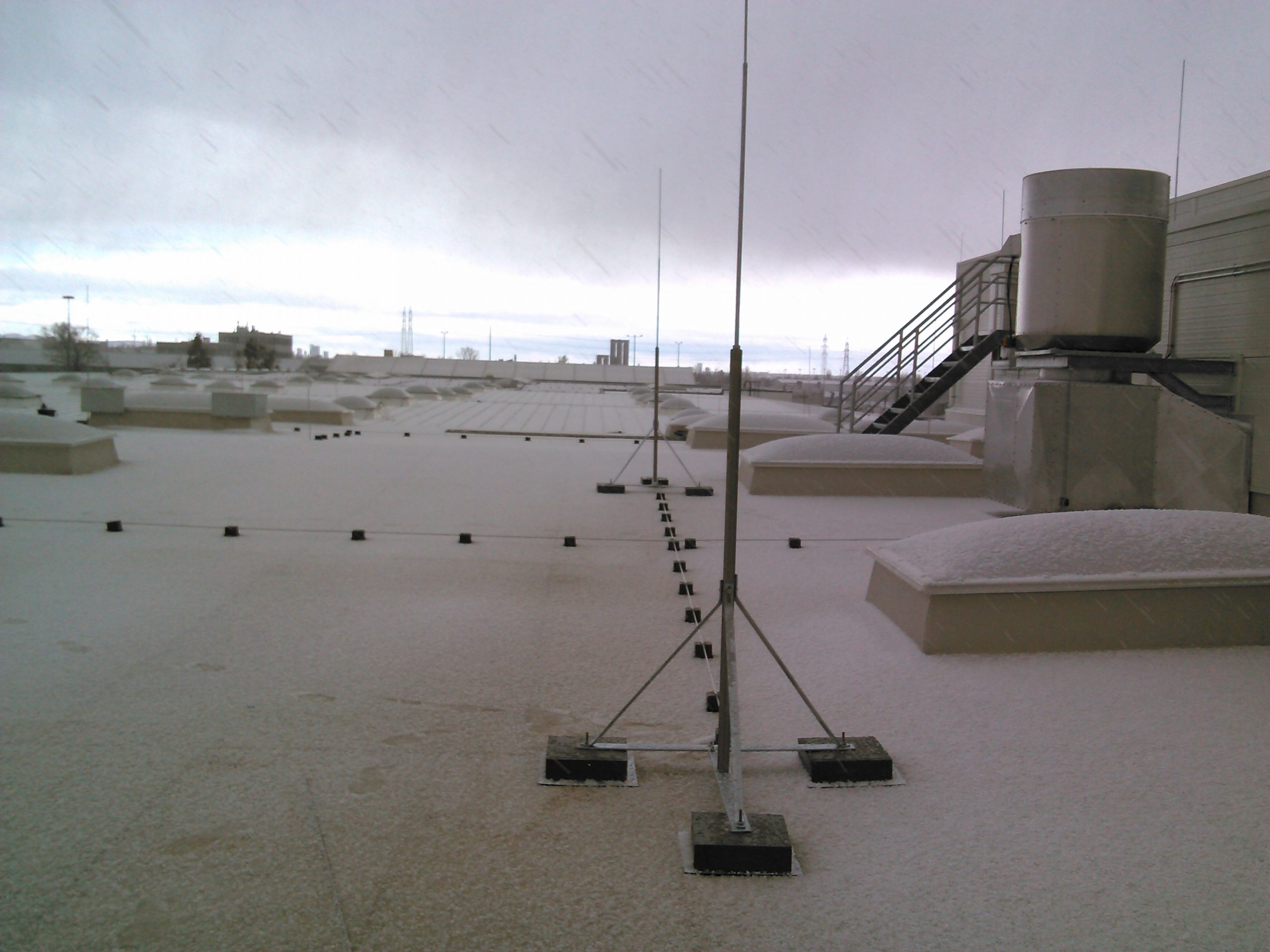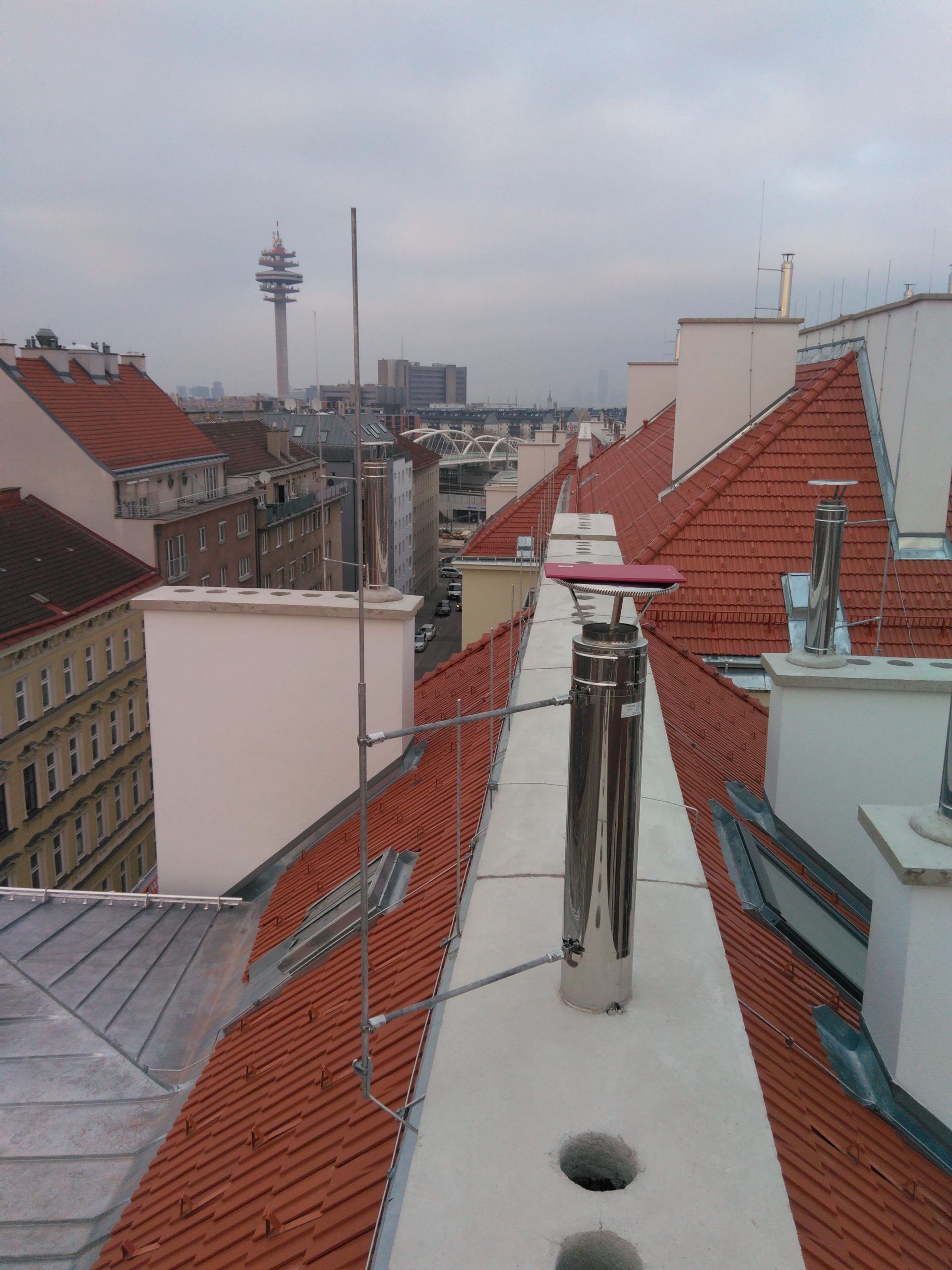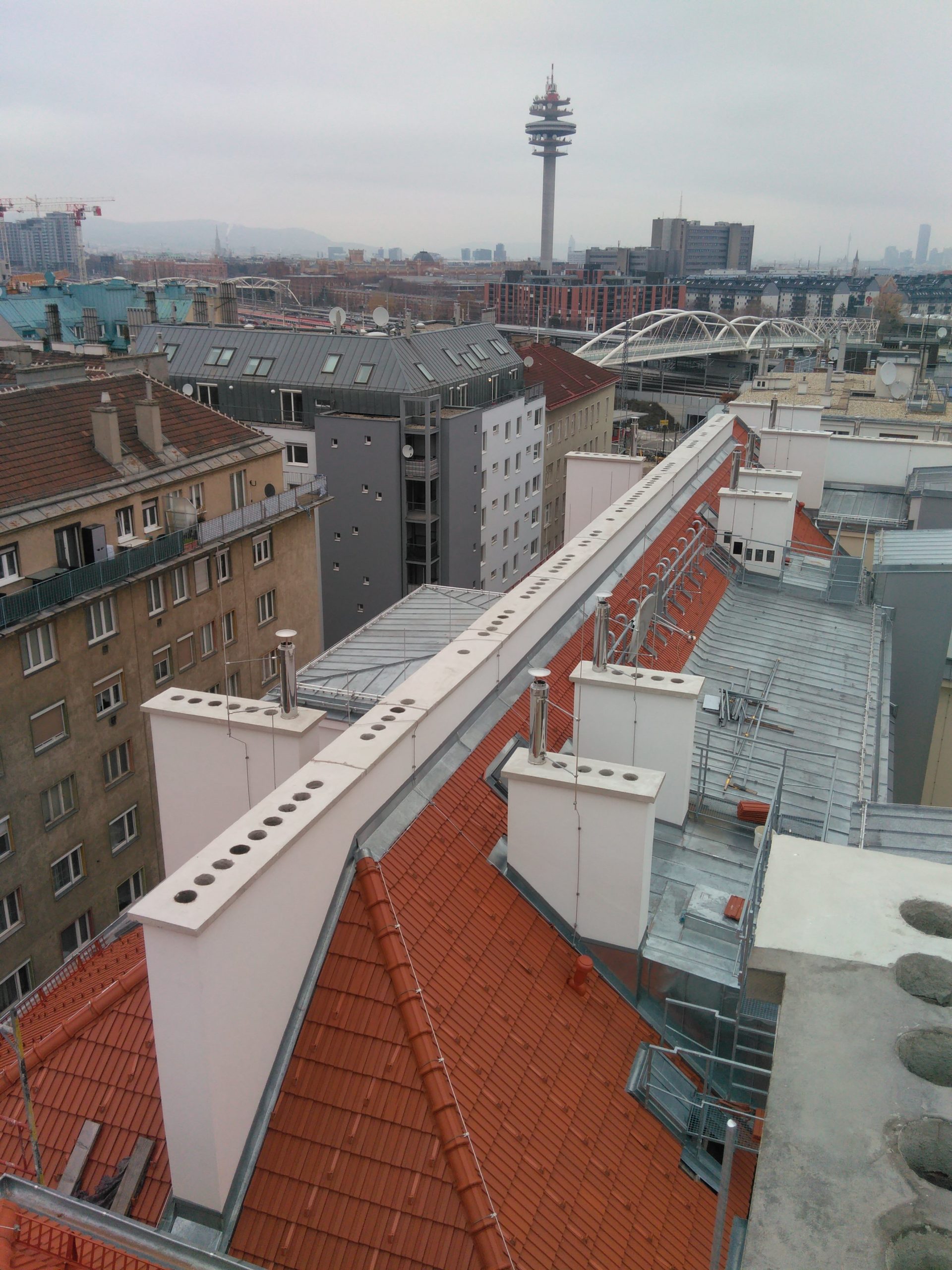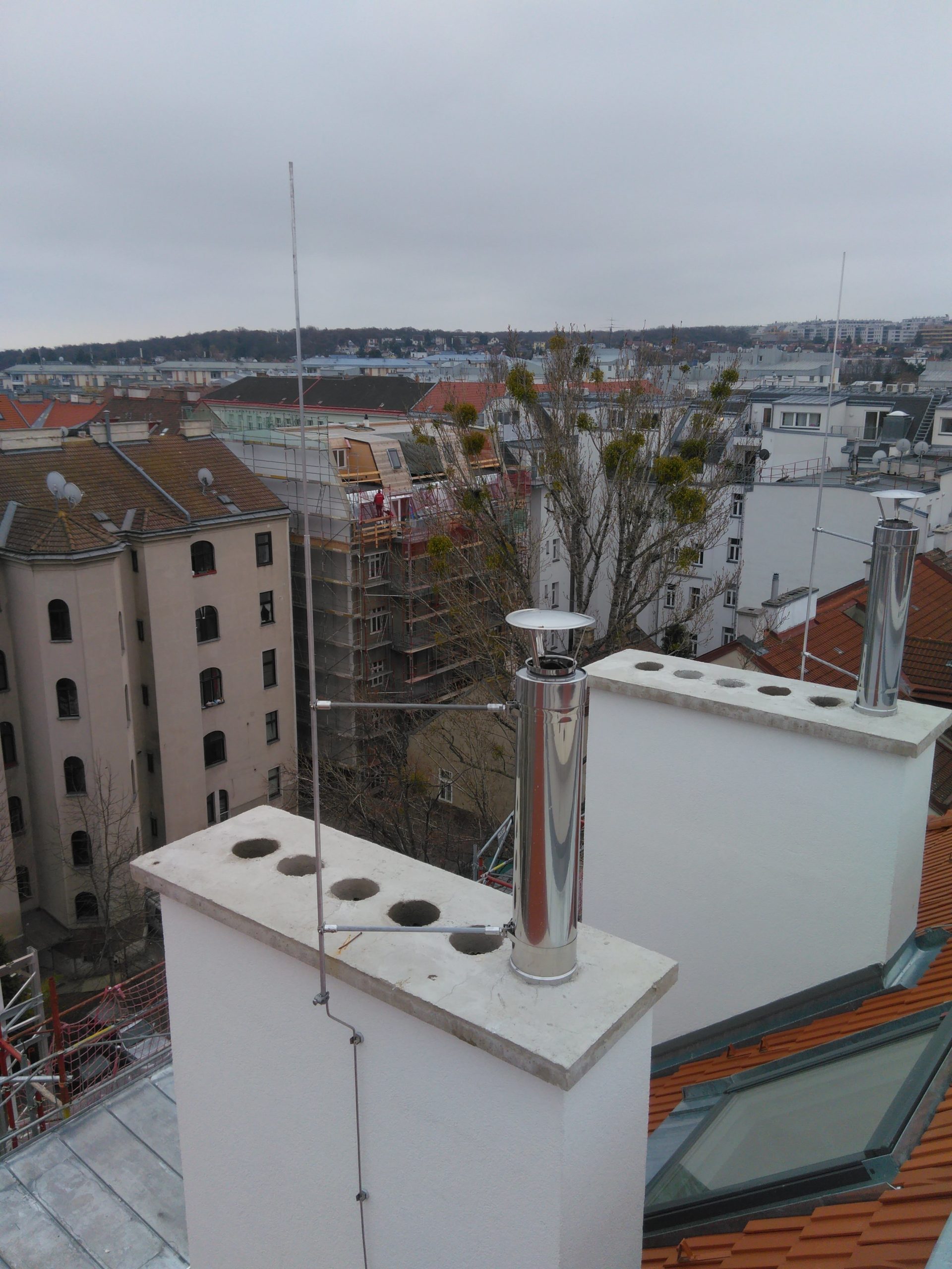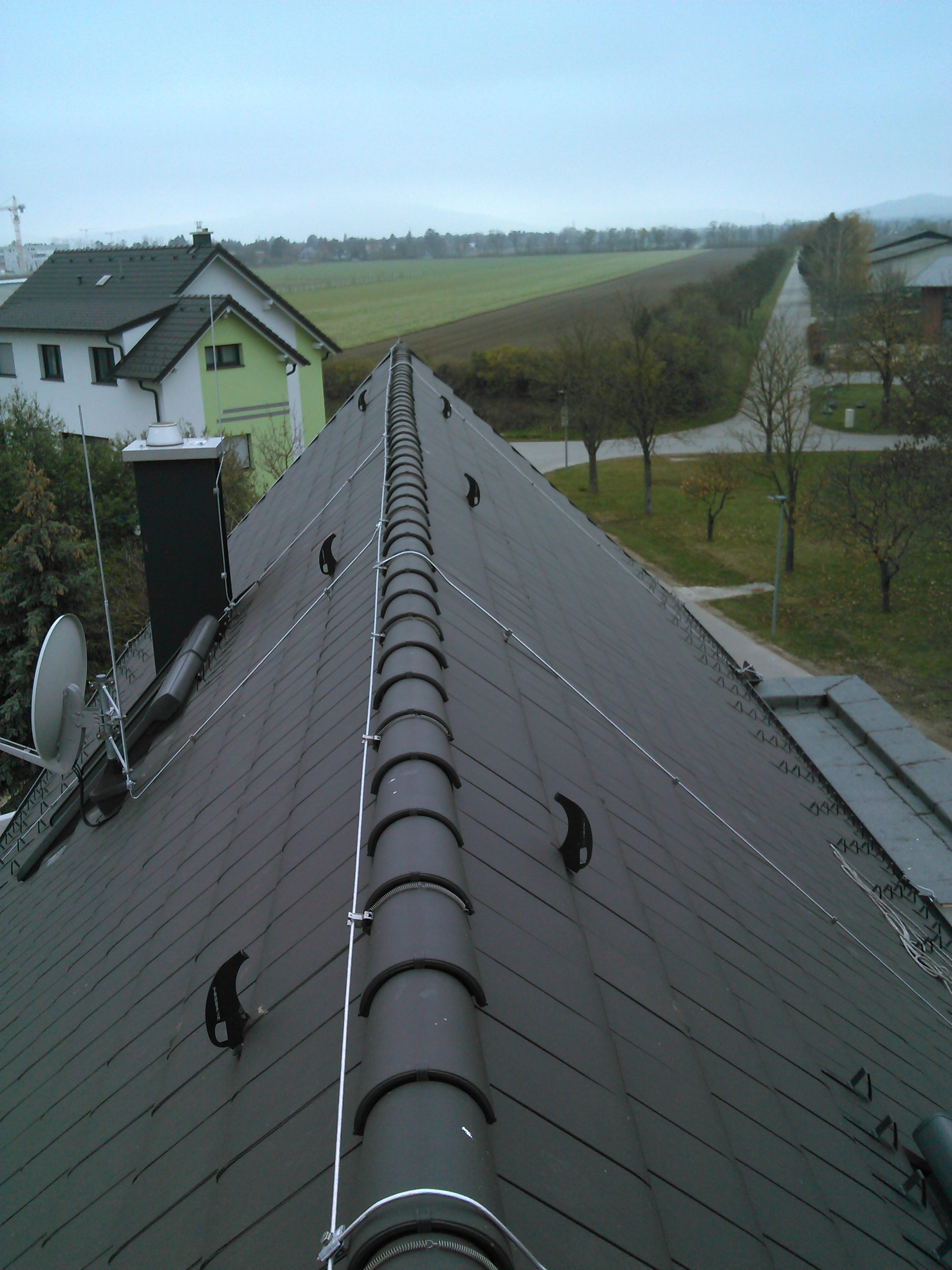 Die Blitzschutzanlage beinhaltet ein gewisses Maschennetz am Dach bzw. Ableitungen an der Fassade. Die Ausführung der Blitzschutzanlage am Dach erfolgt mit Rundleiter 8mm Alu, verzinkt bzw. Kupfer. Bei den Kaminen sind entsprechende Fangeinrichtungen vorzusehen (Fangspitze mit DM 10mm bzw. Fangstangen mit DM 16mm). Sämtliche elektrische Bauteile sind mit einer isolierten Fangeinrichtung zu versehen. Sämtliche metallischen Teile müssen miteinbezogen werden. Es ist zu beachten, dass die Näherung zu den elektrischen Bauteilen im Gebäude einzuhalten ist, da es ansonsten zu einem Überschlag kommt. Daher ist eine Unterdachanlage nicht empfehlenswert.